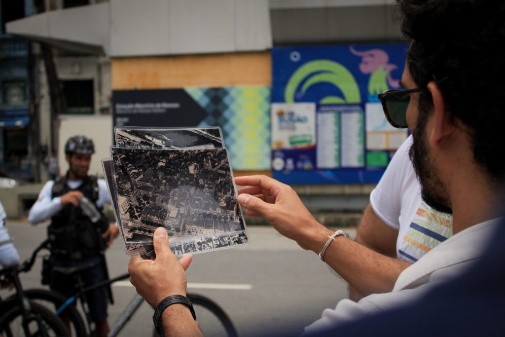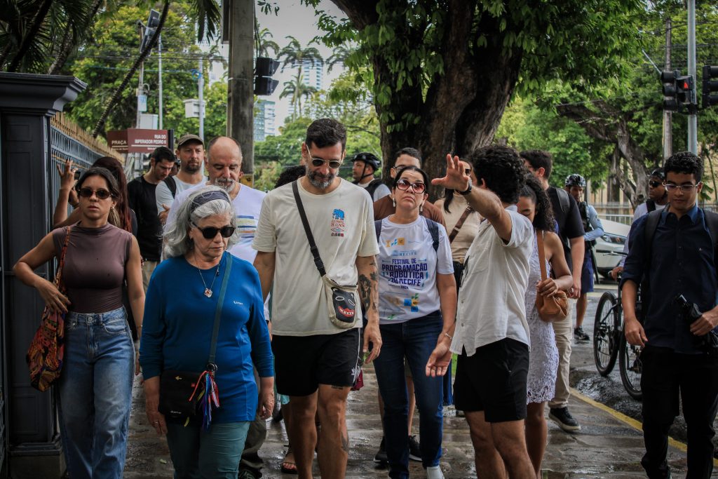 A atividade “Do Porto ao Pátio” consistiu em um percurso guiado pelo centro do Recife, conectando o Bairro do Recife à área do Pátio de São Pedro. O trajeto apresentou os principais marcos históricos da reabilitação urbana, com destaque para a influência francesa na formação da cidade e nas obras de urbanismo, engenharia e arte pública. Durante o percurso, foram utilizados mapas históricos e materiais de apoio. A experiência incluiu pontos como o Teatro de Santa Isabel, Praça da República, Ponte Maurício de Nassau, Mercado de São José e Pavilhão Francês no Pátio de São Pedro