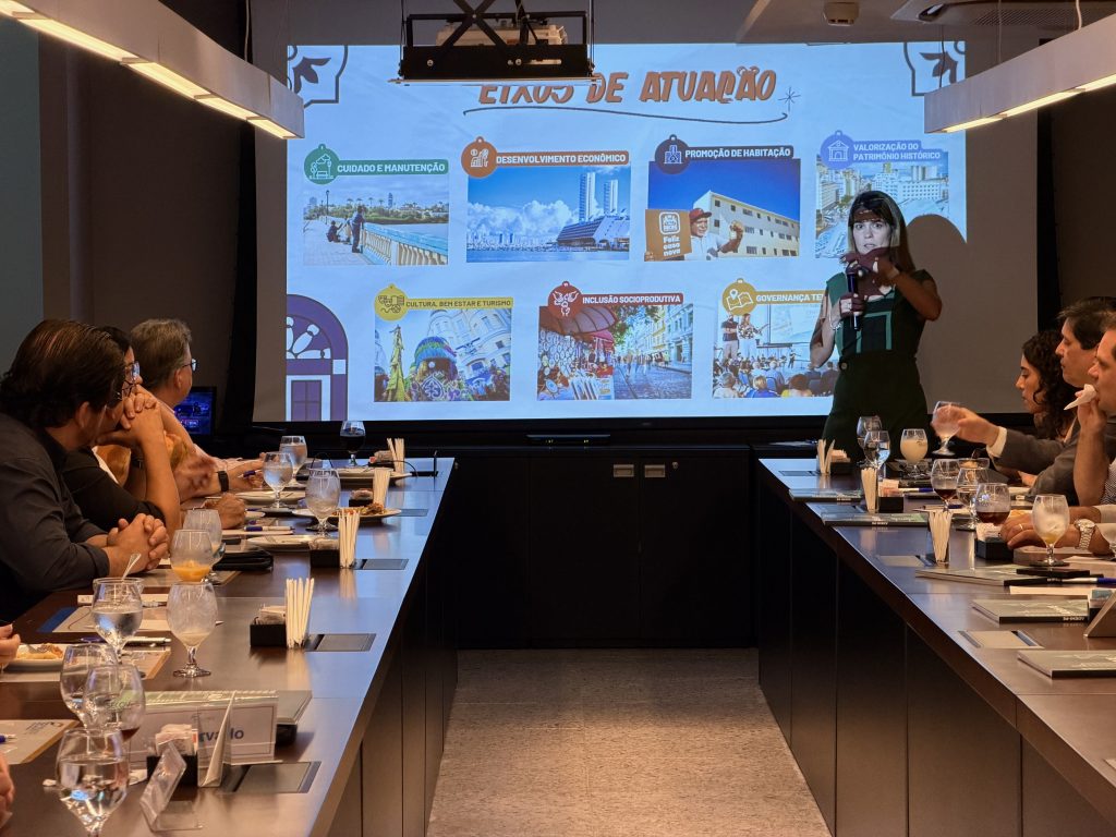 O encontro foi conduzido pela chefe do Gabinete do Centro do Recife, Ana Paula Vilaça, que apresentou as estratégias em curso e reforçou a importância da aproximação com o setor imobiliário.