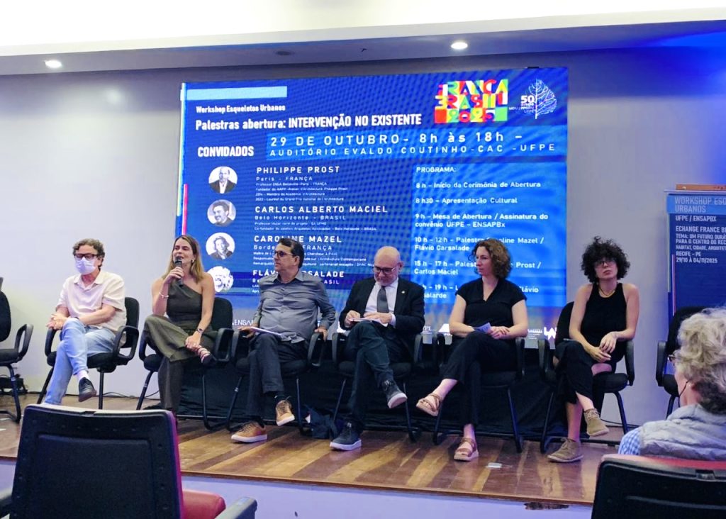 No dia 29 de outubro aconteceu a abertura do Workshop Esqueletos Urbanos UFPE/ENSAPBX, ativididade que faz parte da temporada Brasil-França 2025. A abertura contou com falas de abertura de diversos representantes acadêmicos de ambas as nações, inclusive da chefe do Gabinete do Centro, Ana Paula Vilaça. As discussões pautaram entorno do esvaziamento das áreas centrais e os residuais edifícios inutilizados e obsoletos, construindo um debate acerca das possibilidades projetuais que visam mitigar essa problemática.